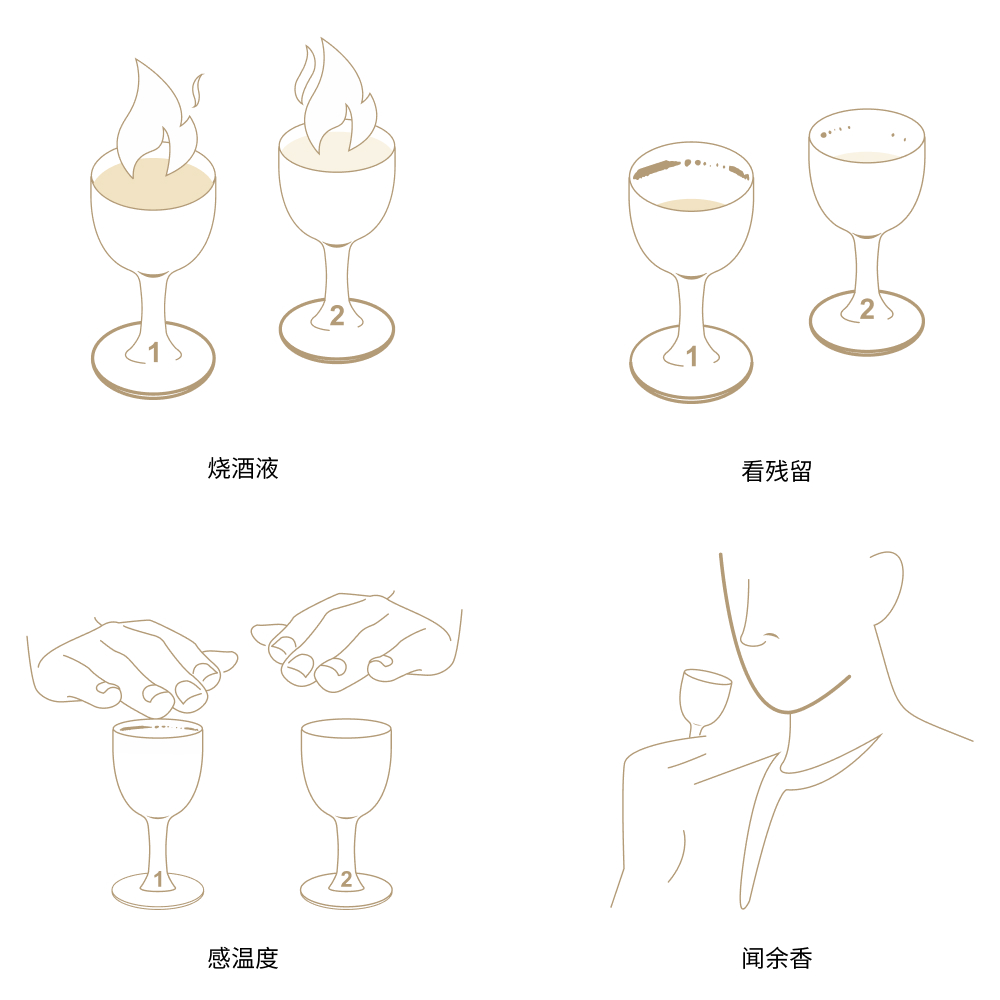 火焰熄灭后,即可用手在白瓷燃烧杯上方感受温度。品质好的酒,酒体醇厚丰满,缔合更紧密,因而燃烧时氧化反应程度低、自由基生成少,酒中物质燃烧不充分,产生的热量少。所以能感觉到杯体温度相对低,杯壁上残留的棕色物质多。而且,燃烧后的余液香气馥郁舒适,留香更久,有明显的花果熟甜香。